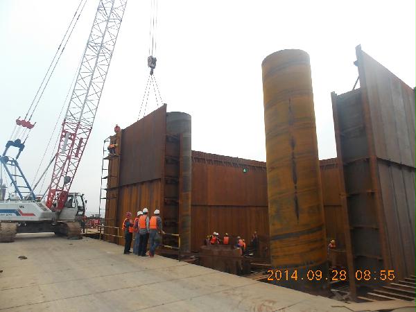 “巨龙一号”钢吊箱重量约为780吨,是中国建筑目前体积最大的钢吊箱。(杨宁)