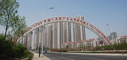 自贸区门区工程位于海河南岸的天津大道和迎宾大道交口,工程总跨度82米,用钢量达140吨,安装公司历时28天如期完成施工任务。(张炜昊)