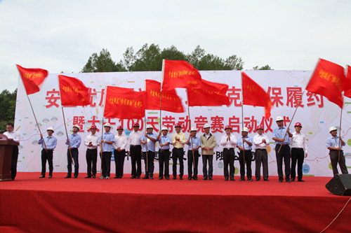 当日,中建股份鹤大高速项目开展了“安全优质促进度,攻坚克难保履约大干100天夏秋攻坚劳动竞赛”活动。鹤大总经理部执行总经理王宏宇总结了2014年大干120天保履约活动情况,并代表鹤大总经理部与各标段项目经理签订了《2015年劳动竞赛责任书》。王祥明同吉林省高等级公路建设局鹤大高速公路项目靖通建设指挥部指挥长孙鹏程等领导共同为鹤大高速ZT12标至20标的9个标段授中建鹤大高速“协同联动先锋队”旗帜,马剑忠为中建鹤大高速总经理部授“中建鹤大安全质量督察队”旗帜。孙鹏程、吴春军分别代表业主及中建六局做重要讲话,活动在王祥明发布启动令后正式开始,鹤大高速项目再次掀起了大干的热潮。