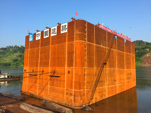 “神龙号”钢围堰采用传统的气囊法下水,项目部施工技术人员通过受力计算、现场模拟等手段,为钢围堰在洪水期下水做了充分准备。下午14时30分,四台卷扬机同时开始工作,钢围堰顺着下水坡道缓缓前行,3小时后,“神龙号”终于完成了与渠江水的第一次亲吻,顺利进入渠江。