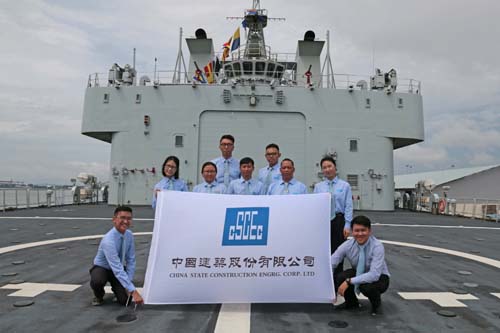 中建六局文莱淡布隆跨海大桥CC4标段项目员工早早整齐列队,挥舞两国国旗,热烈欢迎海军远航访问编队官兵到访。