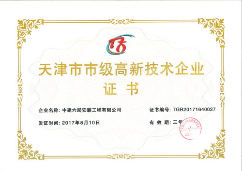 近日,中建六局安装公司顺利通过天津市级高新技术企业认定,荣获“天津市市级高新技术企业”称号。