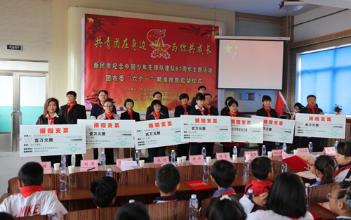 精准扶贫启动仪式前,新民市第六小学举行了少先队员入队仪式,25名一年级新生加入了少先队,成为一名光荣的少先队员。共青团沈阳市委书记张明,桥梁公司党委副书记李伟、党委工作部部长霍薪雨,新民市相关领导参加了入队仪式,并为新民市“最美红领巾”颁发了荣誉证书。